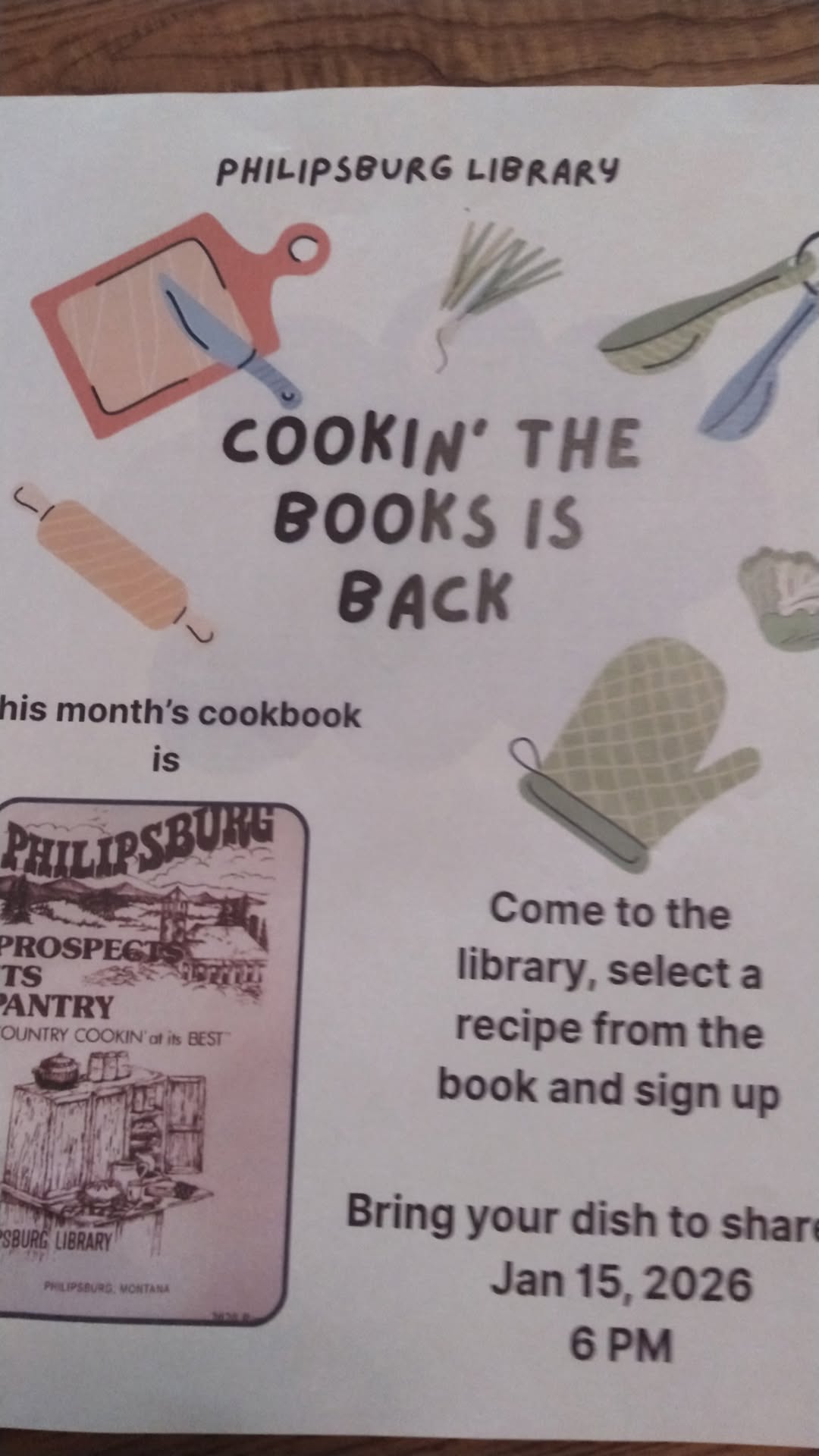 Pick a recipe from “Philipsburg Prospects Its Pantry”, there is a copy at the library front desk, make a copy of the recipe, make the meal and bring it on the night of the event. You will try new foods and meet new people.