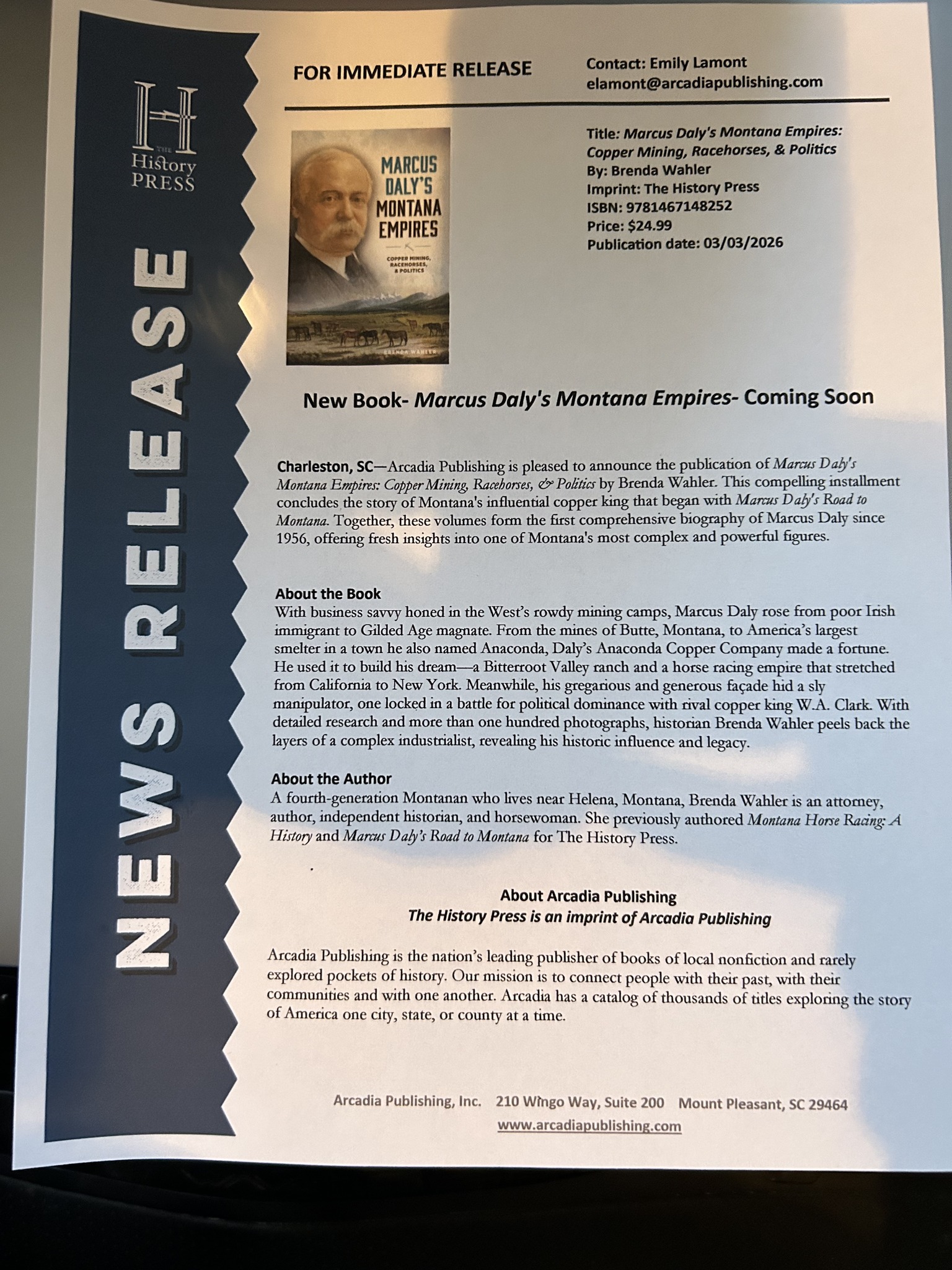 Please join us for an evening with Brenda Wahler, author and fourth-generation Montanan, discussing her new book, “Marcus Daly’s Montana Empires,” at the historic Montana Hotel on March 6, 2026, from 6:00 p.m. to 8:00 p.m. Light refreshments will be served.