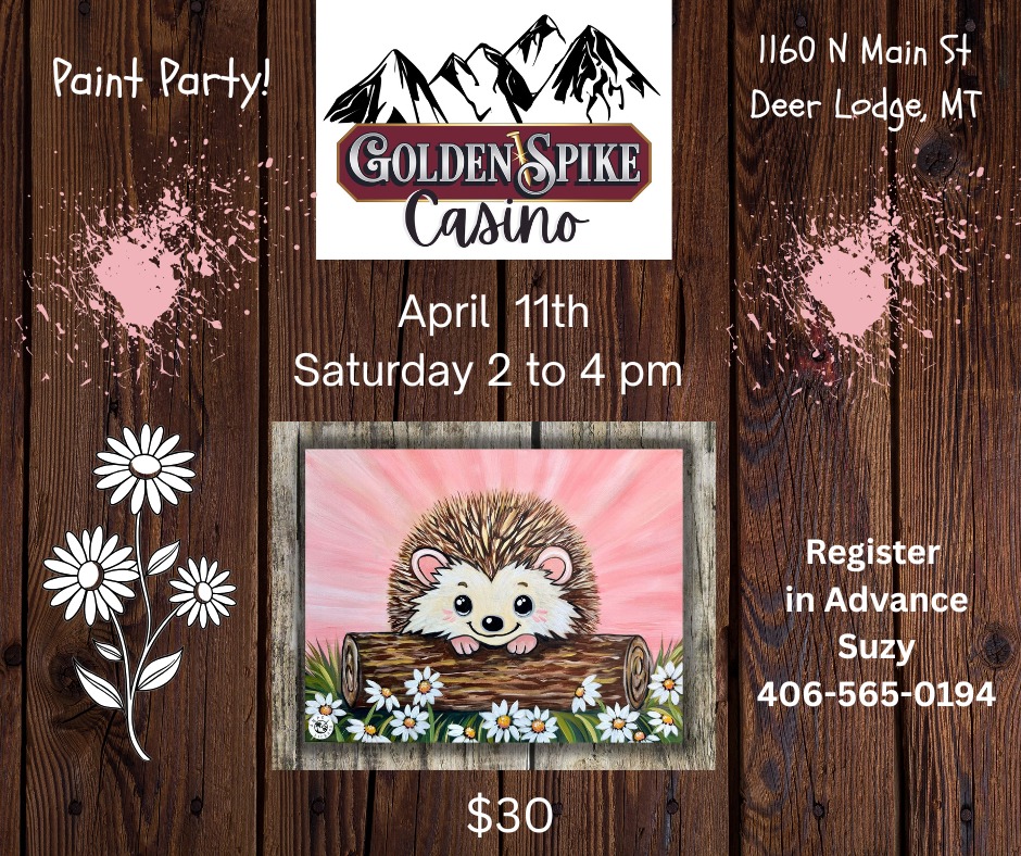 Come join us at Golden Spike Casino and paint this adorable Hedgehog! Register in Advance with Suzy 406-565-0194 You will be provided with everything you need!