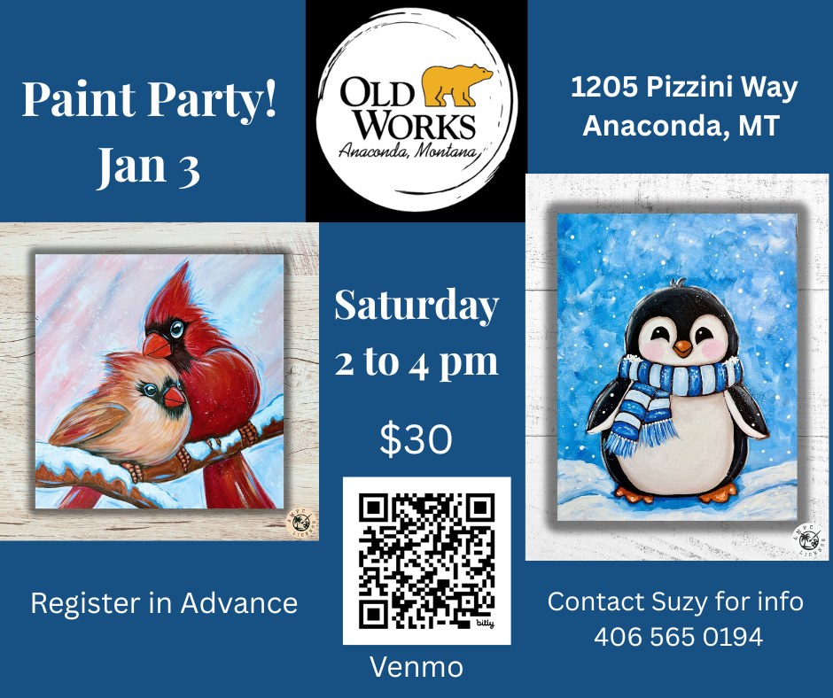 Pick your design to paint and join us at Old Works! Register in advance with Suzy at 406-565-0194