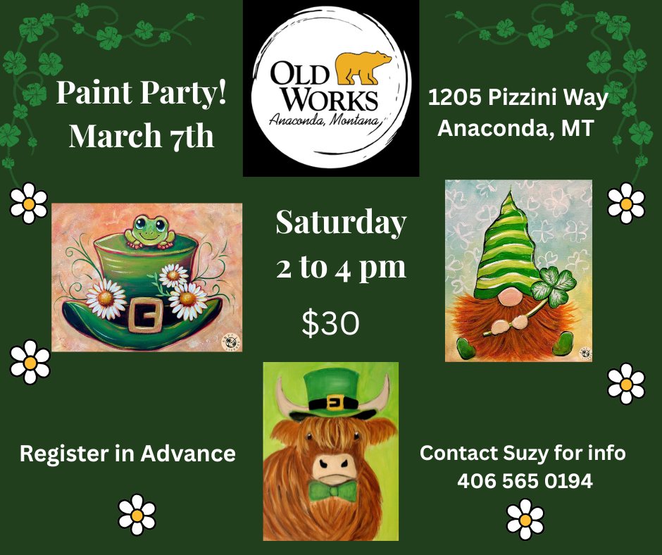 Join us at the beautiful Old Works in Anaconda and paint a St Patrick’s design! Register in advance. Your canvas will be pre drawn and ready for you! Accept payment by Venmo, ck or cash. Contact Suzy 406-565-0194