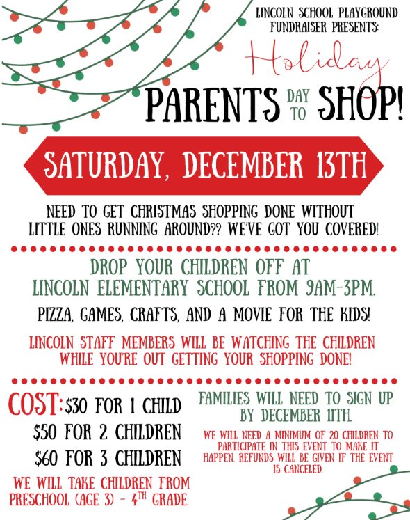 Need to get your shopping done without your little ones! Lincoln Elementary has you covered! Saturday, Dec. 13, 9 a.m.-3 p.m. at the school! Pizza, games, crafts, and more!